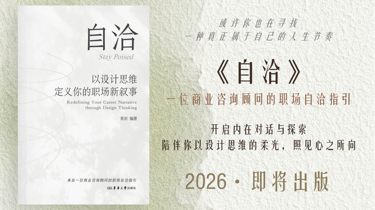 Intuivia 拾方叙事创始人莫奈的书籍作品《自洽:以设计思维定义你的职场新叙事》将于2026年1月下旬出版。书中将「人群脉轮」方法论延伸至个体成长领域,提出“做自己的策展人”。在AI与组织变革的时代,通过持续的自我觉察与外部现实环境理解,以设计思维主动构建属于自己的职业向上路径。