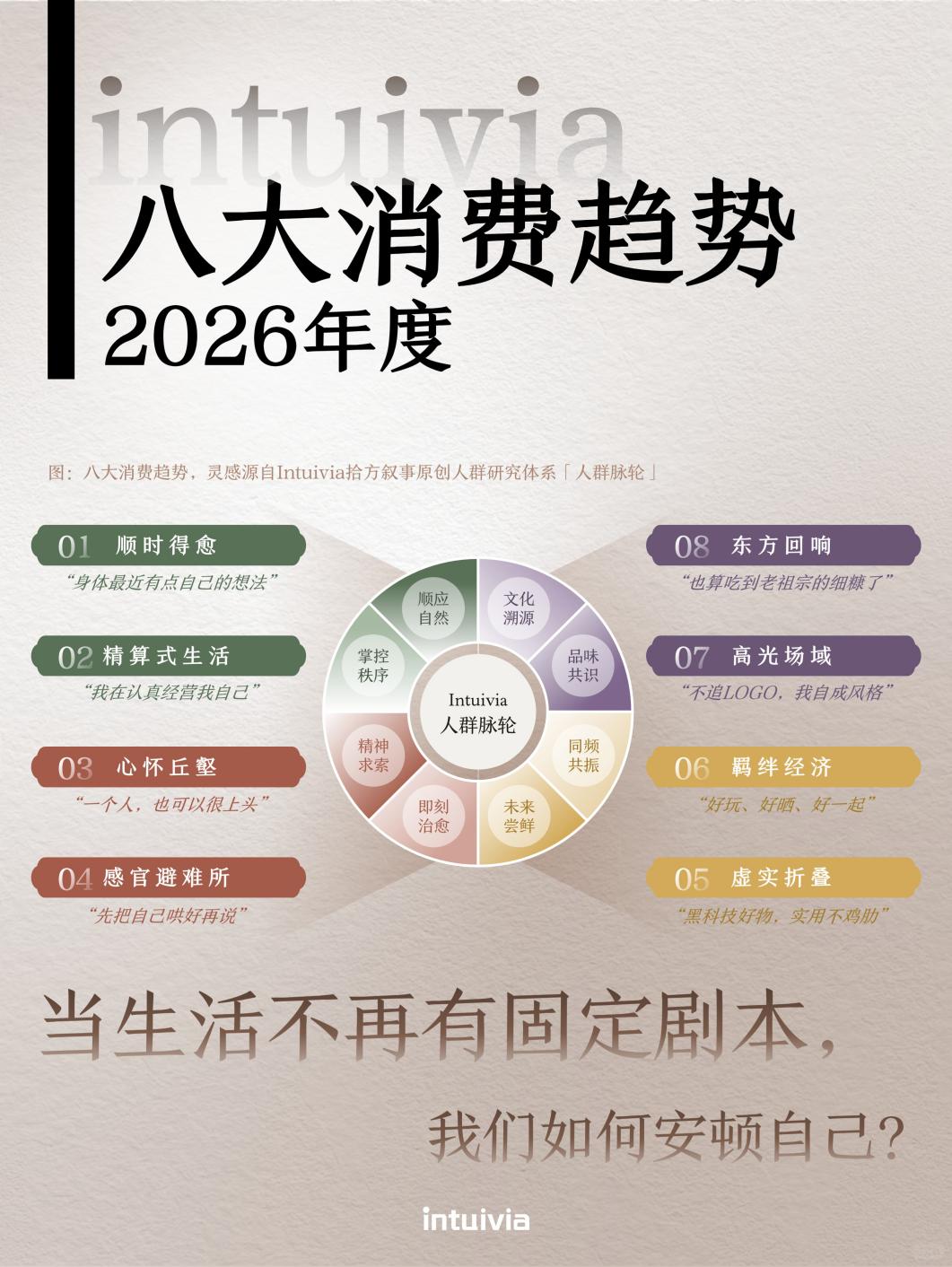 基于这一视角,Intuivia 给出2026八大消费趋势的预判,揭示人们如何在流动时代主动构筑“自洽”的生活: